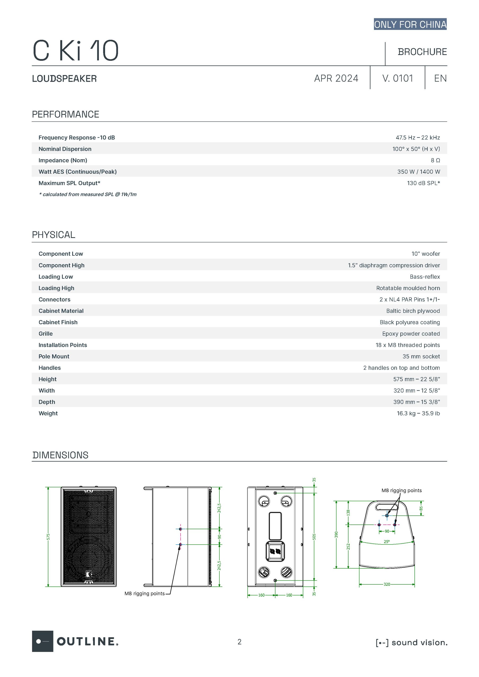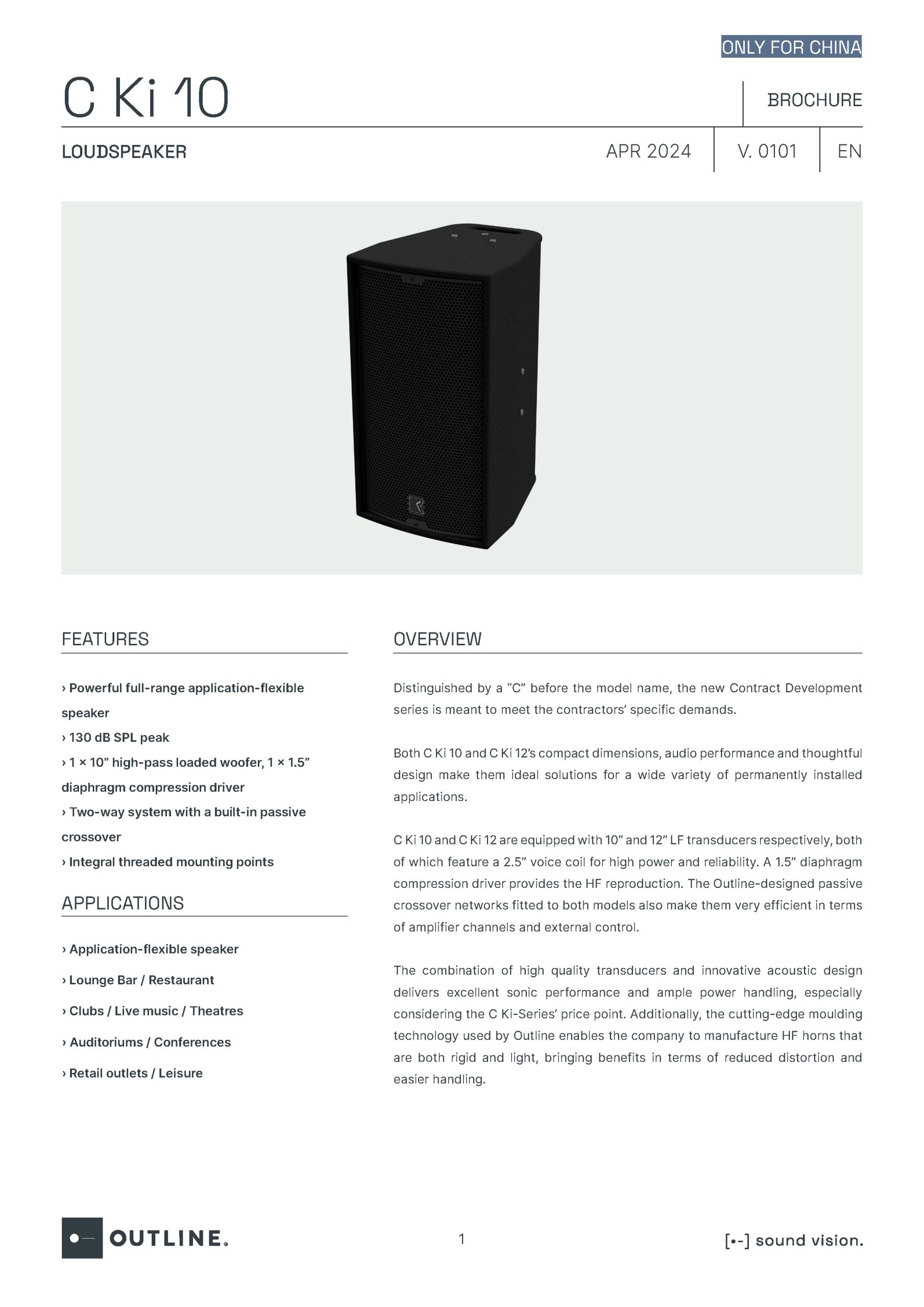 C Ki 10 là mẫu loa passive 2 đường tiếng thuộc dòng Contract Development Series (C Series) do Outline thiết kế chuyên biệt dành cho các công trình lắp đặt cố định. Với thiết kế nhỏ gọn, chất lượng âm thanh cao và độ bền vượt trội, C Ki 10 là giải pháp hiệu quả cho các hệ thống âm thanh chuyên nghiệp trong nhà hàng, bar, hội trường, sân khấu nhỏ hoặc không gian thương mại cao cấp.