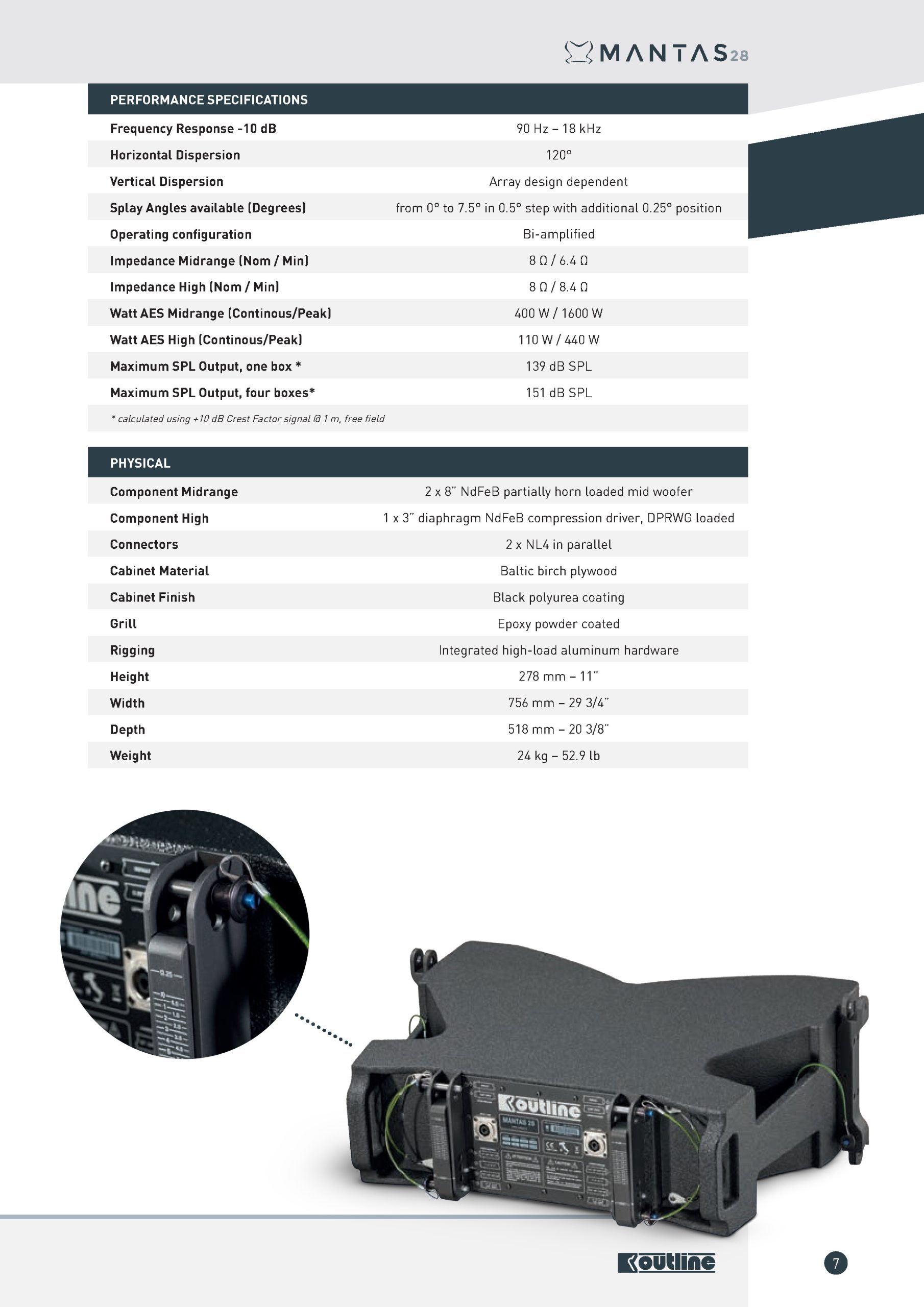 Thùng loa được làm từ gỗ bạch dương Baltic, phủ lớp sơn polyurea màu đen siêu bền, chống trầy xước và chống chịu thời tiết nhẹ. MANTAS 28 sử dụng 2 cổng NL4 kết nối song song và có cấu trúc rigging nhôm tải trọng cao, giúp dễ dàng triển khai trong nhiều tình huống lắp đặt.