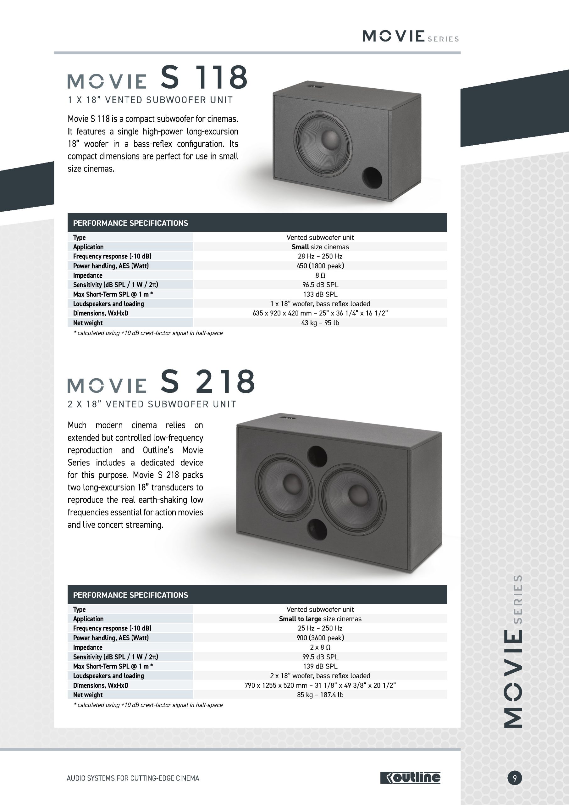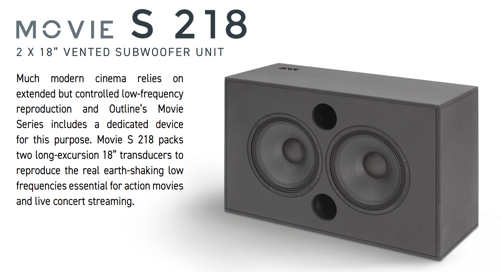Với thiết kế dạng thùng bass reflex, trang bị 2 củ loa 18” hành trình dài, MOVIE S218 có thể tái tạo âm thanh từ 25 Hz đến 250 Hz, đạt SPL tối đa 139 dB, đem lại hiệu ứng rung chuyển chân thực mà các nhà làm phim hướng đến.