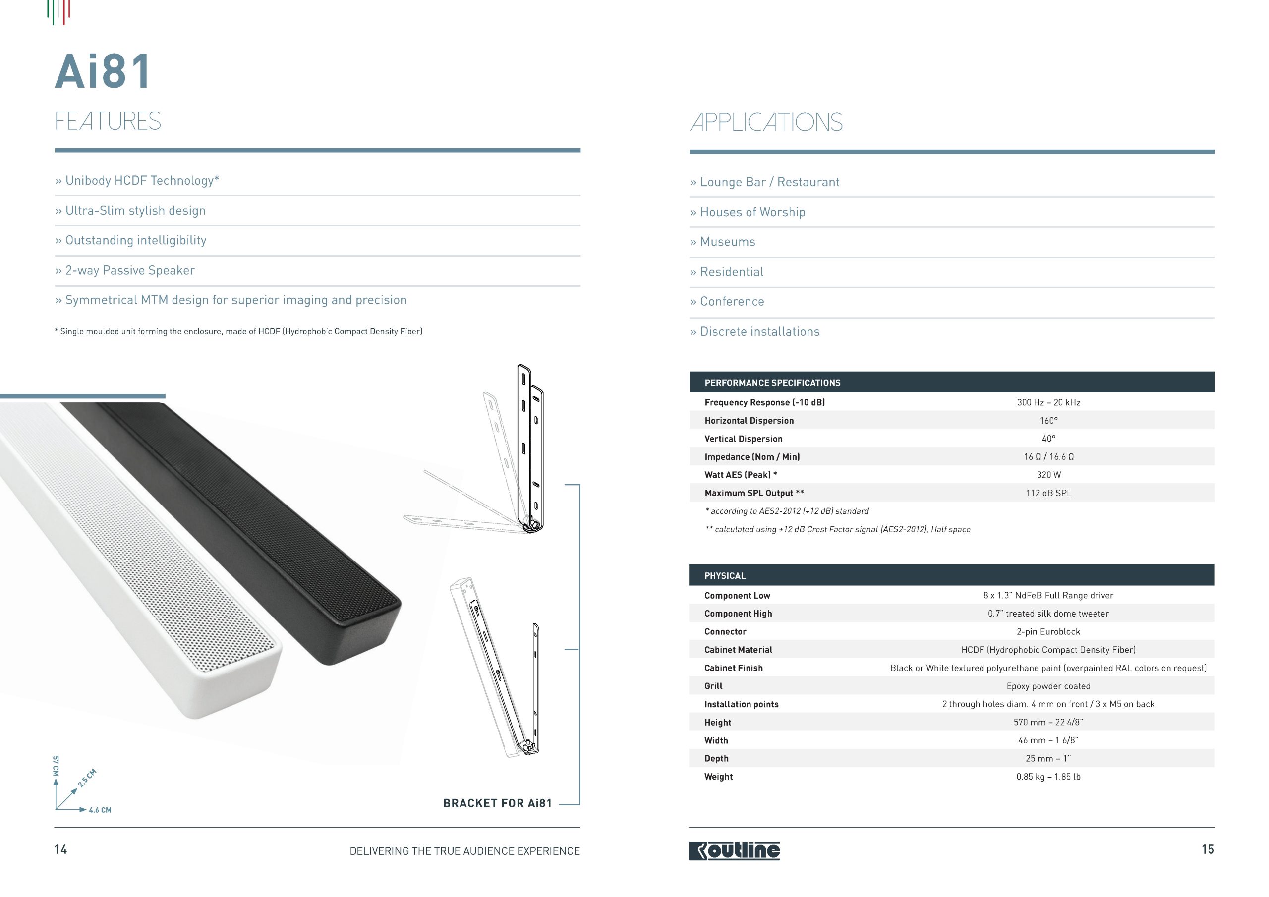 Outline Ai 81 là mẫu loa cột 2 đường tiếng siêu mỏng, được thiết kế cho những không gian yêu cầu sự tối giản về thẩm mỹ nhưng vẫn đảm bảo chất lượng âm thanh chuyên nghiệp. Với độ mỏng chỉ 2.5 cm và trọng lượng chưa đến 1 kg, Ai 81 dễ dàng hòa hợp vào mọi không gian như phòng họp, nhà hàng, bảo tàng hay trung tâm hội nghị.