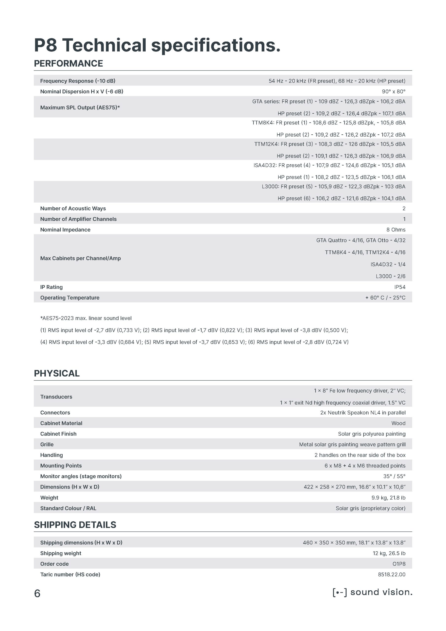 P8 sử dụng một loa trầm 8 inch với cấu trúc bass-reflex, xử lý hiệu quả dải trầm xuống tới 54 Hz. Driver nén 1.5 inch tích hợp họng loa có thể xoay giúp tối ưu dải cao. Mạch phân tần thụ động nội bộ cho phép loa hoạt động chỉ với một kênh công suất.