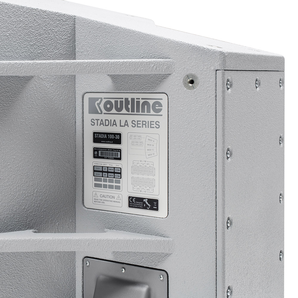 Outline STADIA 100-30 là loa array 2 đường tiếng, cấu trúc cong cố định (constant-curvature array), được thiết kế đặc biệt cho lắp đặt cố định ngoài trời trong các không gian rất lớn như sân vận động, nhà thi đấu, khu vui chơi, công viên giải trí hay quảng trường. Với góc phủ 30° theo chiều dọc và 100° theo chiều ngang, STADIA 100-30 mang lại khả năng kiểm soát định hướng cực kỳ chính xác, đảm bảo âm thanh rõ ràng, mạnh mẽ và phủ đều trong những khu vực rộng lớn.