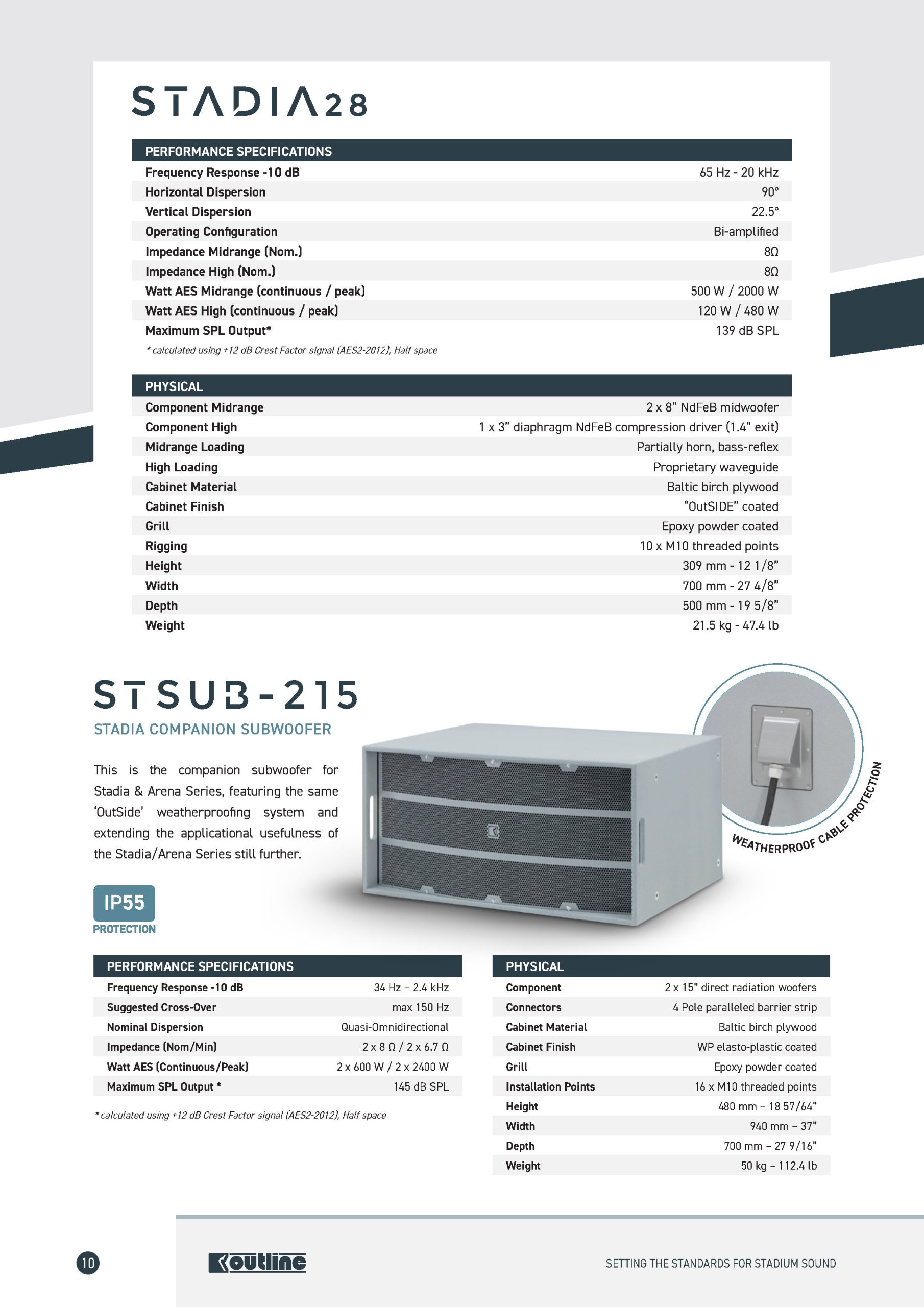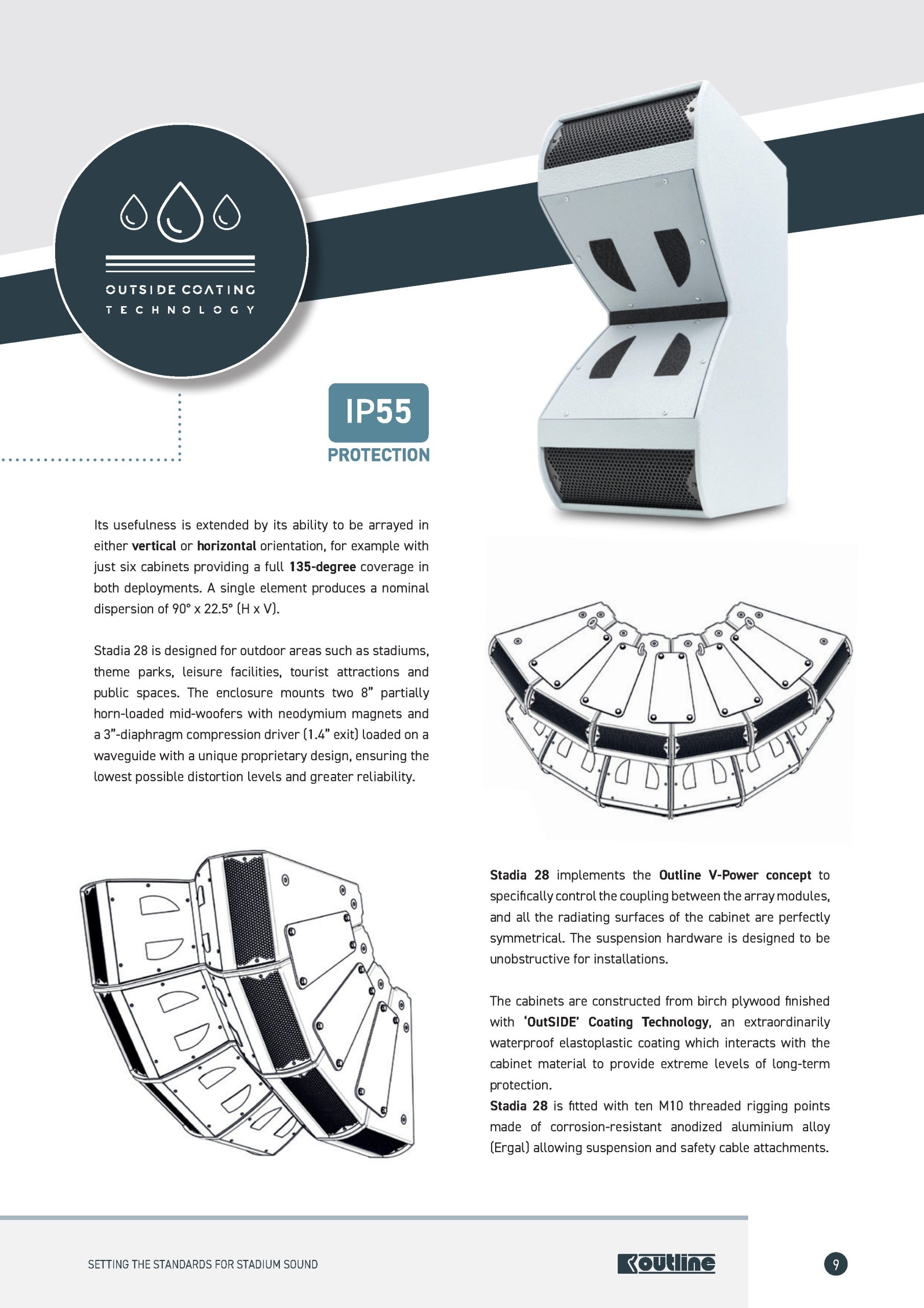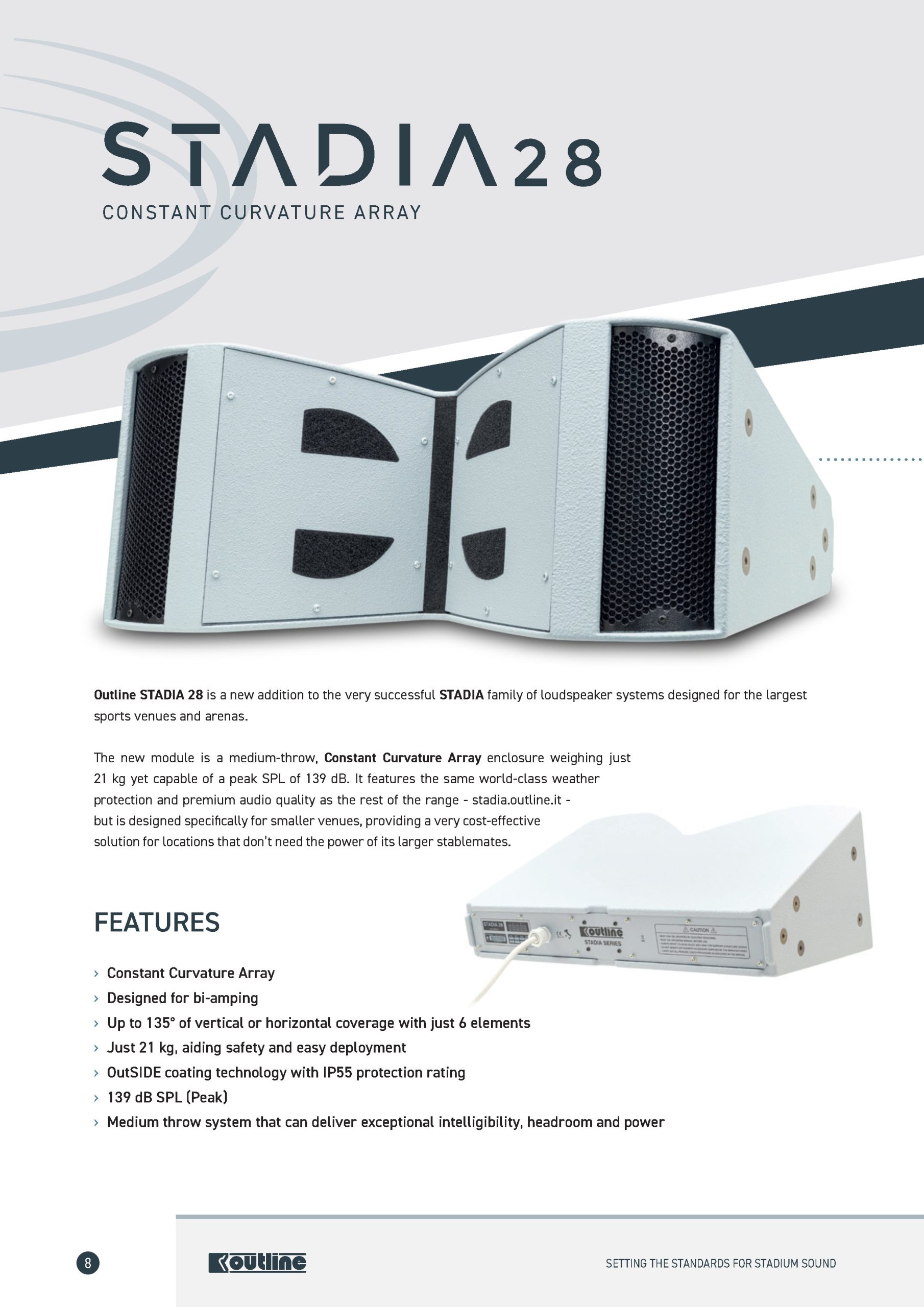 Outline STADIA 28 là mẫu loa array hai đường tiếng có thiết kế Constant Curvature, phù hợp cho các hệ thống âm thanh ngoài trời tầm trung như sân vận động vừa và nhỏ, công viên giải trí, quảng trường, khu vui chơi ngoài trời, địa điểm du lịch… Với trọng lượng chỉ 21,5 kg nhưng có thể đạt tới 139 dB SPL, STADIA 28 mang lại hiệu suất mạnh mẽ và độ rõ tiếng vượt trội trong một cấu trúc nhỏ gọn, dễ lắp đặt và tối ưu chi phí.