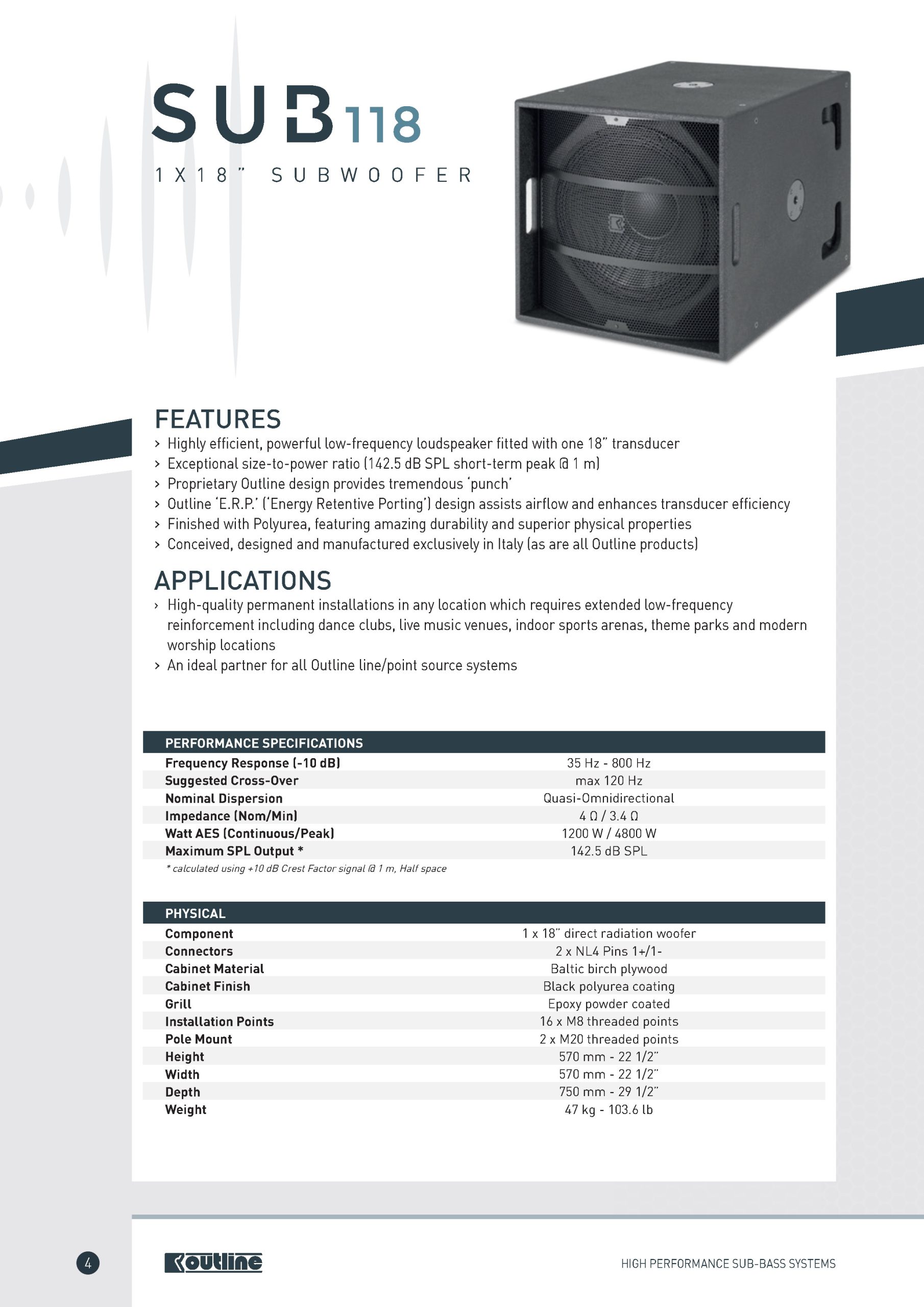 Tất cả sản phẩm của Outline, bao gồm SUB118, đều được thiết kế và sản xuất hoàn toàn tại Ý – đảm bảo độ chính xác cơ khí cao, độ tin cậy dài hạn và chất âm đúng chuẩn châu Âu. Với SUB118, bạn có trong tay một subwoofer đơn nhưng hiệu năng cực lớn, sẵn sàng đáp ứng các yêu cầu khắt khe nhất về âm trầm cho bất kỳ hệ thống âm thanh chuyên nghiệp nào.
