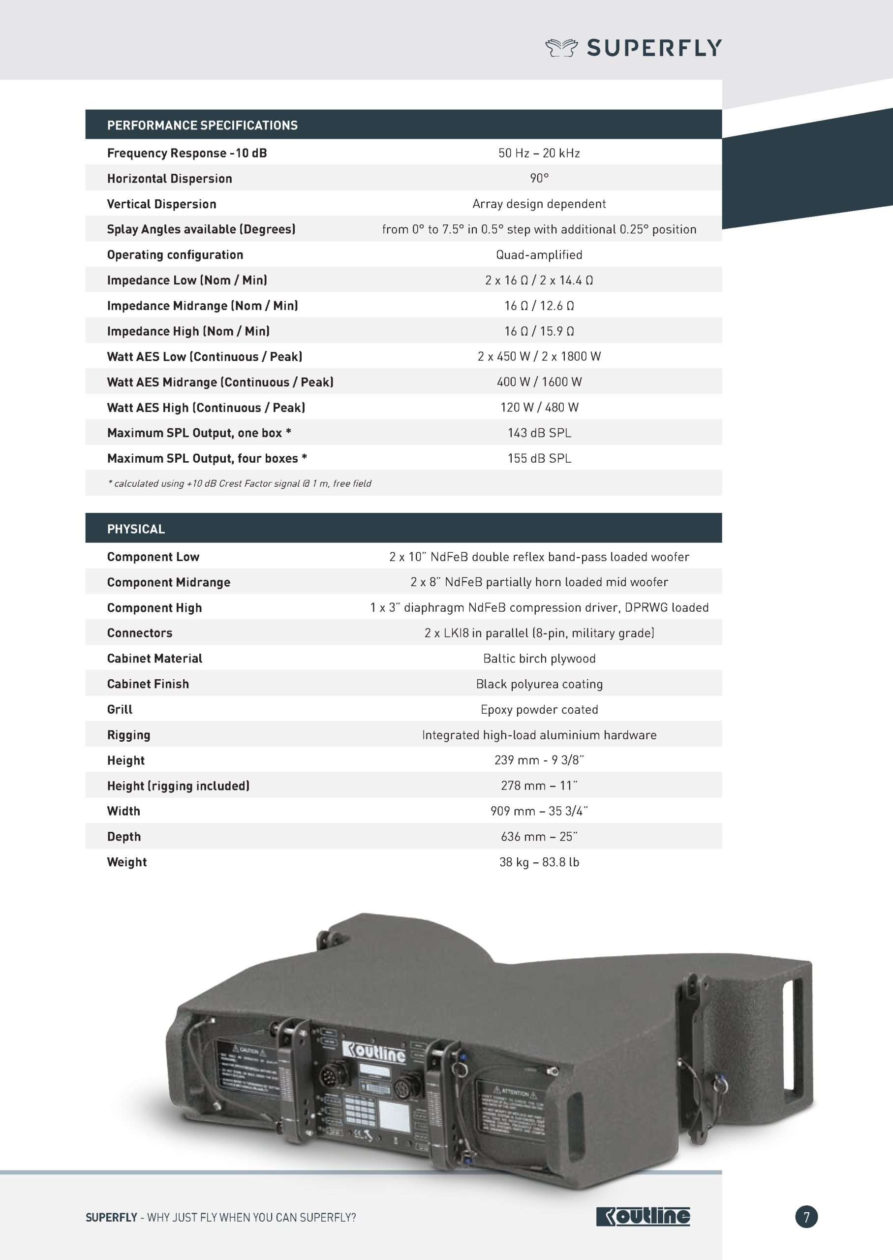 SUPERFLY sử dụng nền tảng ampli DSP dòng GTA của Outline, với mỗi loa được điều khiển độc lập, đảm bảo hiệu suất tối đa. Hệ thống này không chỉ cho âm thanh chính xác trong toàn dải tần từ 50 Hz đến 20 kHz, mà còn mang lại độ rõ nét đặc biệt ngay cả khi không dùng thêm loa sub.