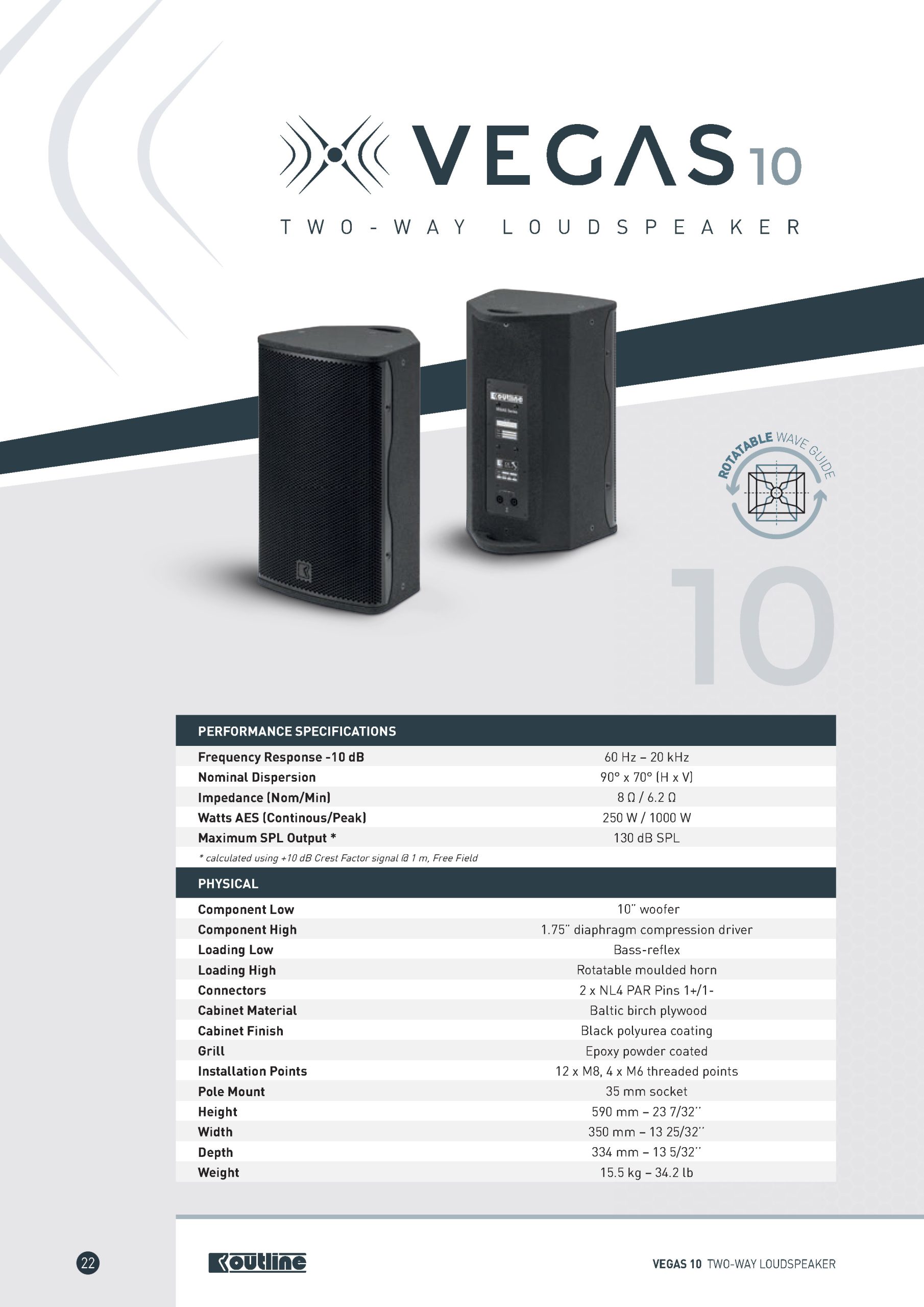 Outline VEGAS 10 là loa 2 đường tiếng passive được thiết kế cho các hệ thống âm thanh chuyên nghiệp trong nhà và ngoài trời, phù hợp cho cả ứng dụng di động lẫn lắp đặt cố định. Với củ loa bass 10” và driver treble 1.75” gắn trên họng tán âm xoay 90° x 60°, VEGAS 10 mang lại âm thanh rõ ràng, chi tiết và mạnh mẽ trong một thiết kế rất nhỏ gọn, chỉ nặng 15.5 kg.