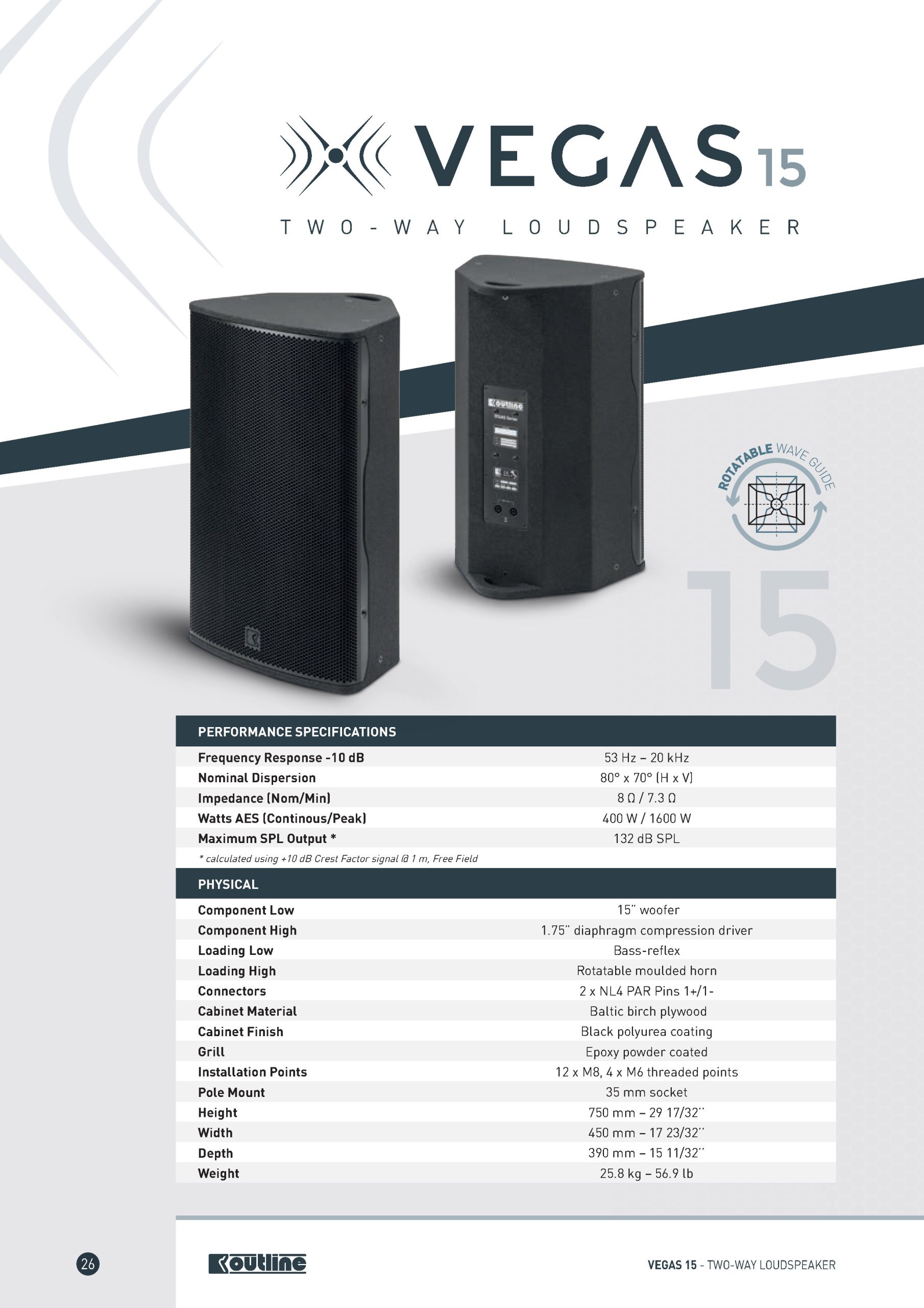 Outline VEGAS 15 là mẫu loa passive 2 đường tiếng sử dụng củ loa bass 15 inch kết hợp với driver nén 1.75 inch gắn trên họng tán âm xoay được, giúp hệ thống dễ dàng thích ứng với nhiều kiểu lắp đặt khác nhau mà vẫn duy trì độ phủ âm chính xác. Với công suất 400W AES, SPL tối đa đạt 132 dB, VEGAS 15 là giải pháp lý tưởng cho các sân khấu biểu diễn, hội trường, nhà thờ, bar-club và sự kiện di động.